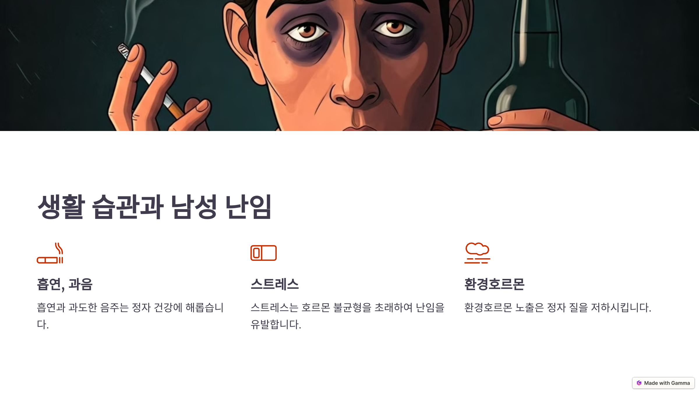 🌍 우리가 매일 하는 습관과 주변 환경도 남성 난임에 큰 영향을 줄 수 있어요. 특히 **흡연, 음주, 스트레스, 환경 호르몬 노출** 등이 정자의 질을 저하시킬 수 있답니다.
