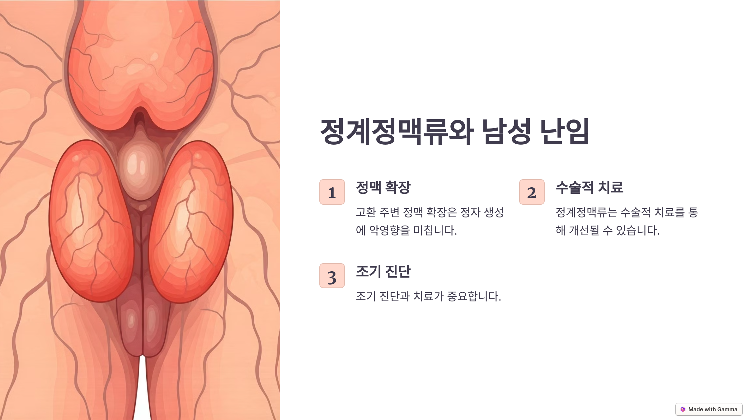 특히 **왼쪽 고환에서 더 자주 발생**하는데, 이는 해부학적 이유 때문이에요. 왼쪽 정계정맥은 오른쪽보다 더 긴 경로를 거쳐야 하기 때문에 혈액이 정체되기 쉬운 구조를 가지고 있죠. 🤔