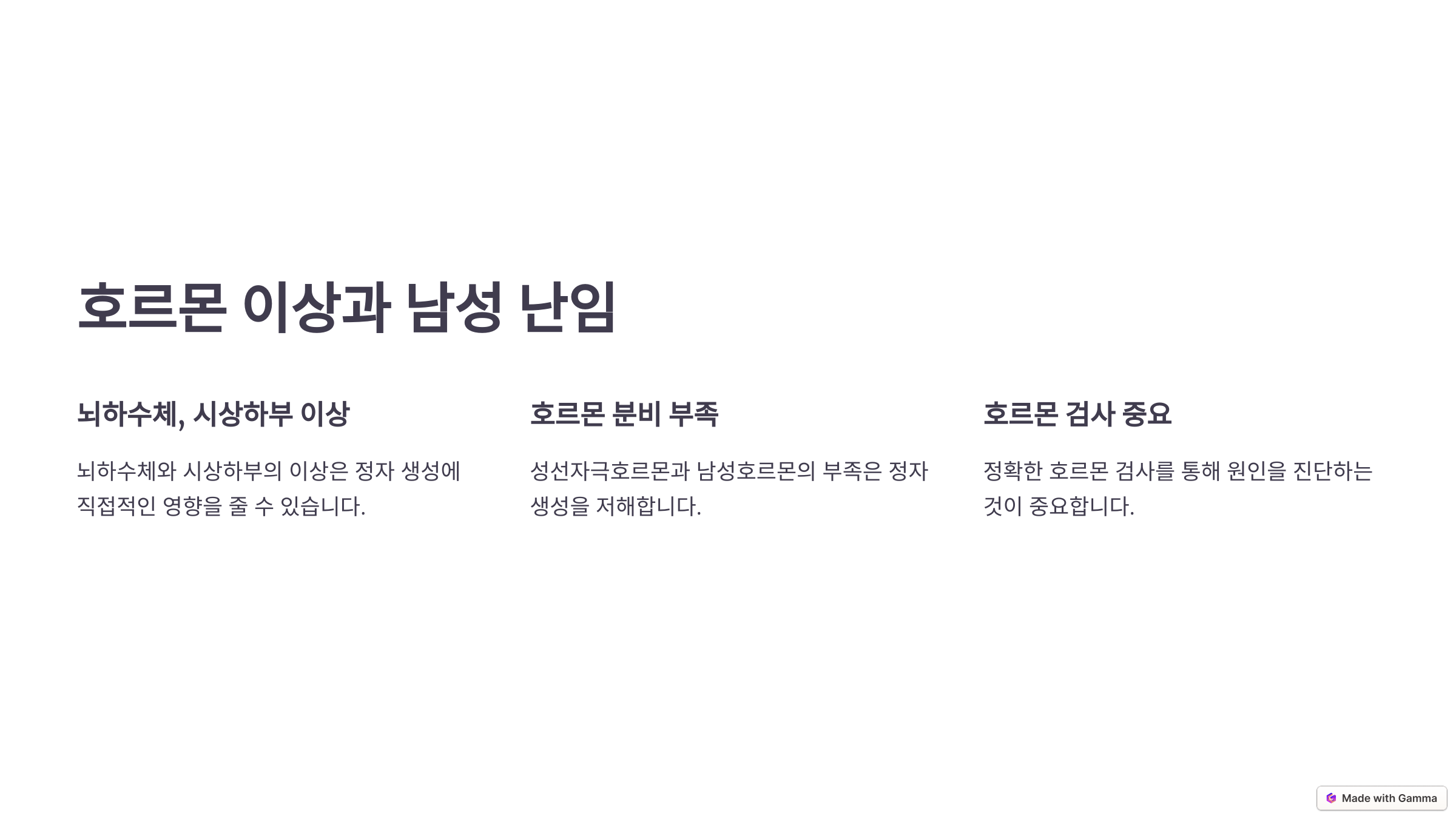 🧬 남성의 생식 기능은 호르몬에 의해 조절돼요. 대표적으로 뇌하수체에서 분비되는 **FSH(난포자극호르몬)**와 **LH(황체형성호르몬)**이 정자 생성을 촉진하는 역할을 해요. 만약 이 호르몬들의 균형이 깨지면 정자의 질이 저하되거나 생산량이 줄어들 수 있어요.