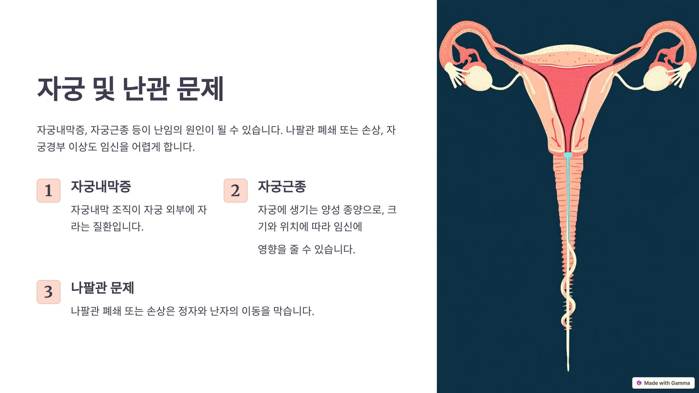이러한 자궁과 난관 문제를 해결하기 위해서는 **초음파 검사, 난관 조영술, MRI 검사** 등을 통해 정확한 원인을 파악하는 것이 중요해요. 치료법으로는 **약물 치료, 호르몬 요법, 수술적 치료(복강경, 자궁경 수술)** 등이 있어요.