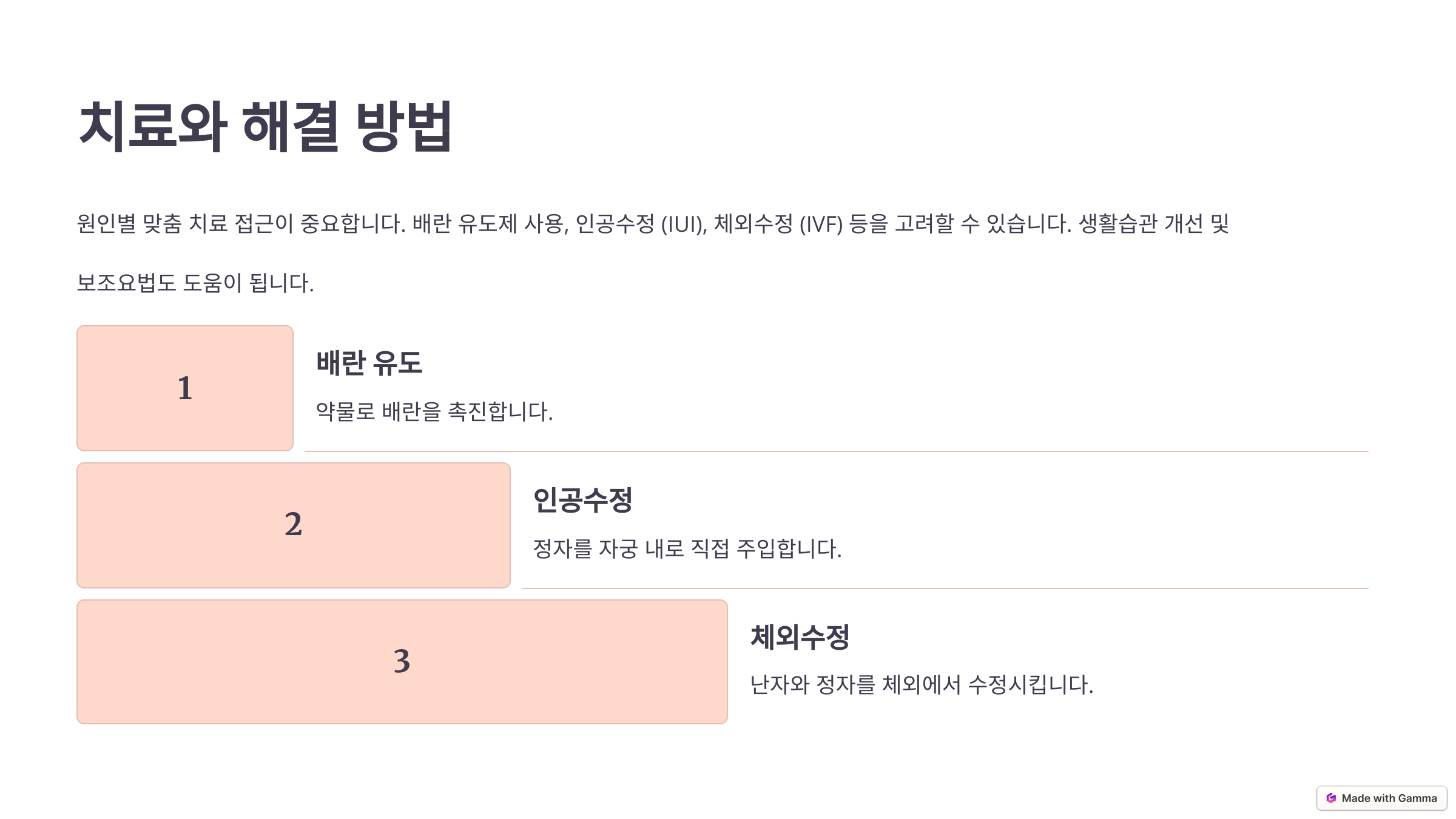 치료법은 난임의 원인과 환자의 상태에 따라 다르게 적용되며, 치료 전 생활습관을 개선하는 것도 중요한 과정이에요. **적절한 운동, 영양 관리, 스트레스 해소** 등이 함께 이루어지면 치료 효과를 높일 수 있어요.