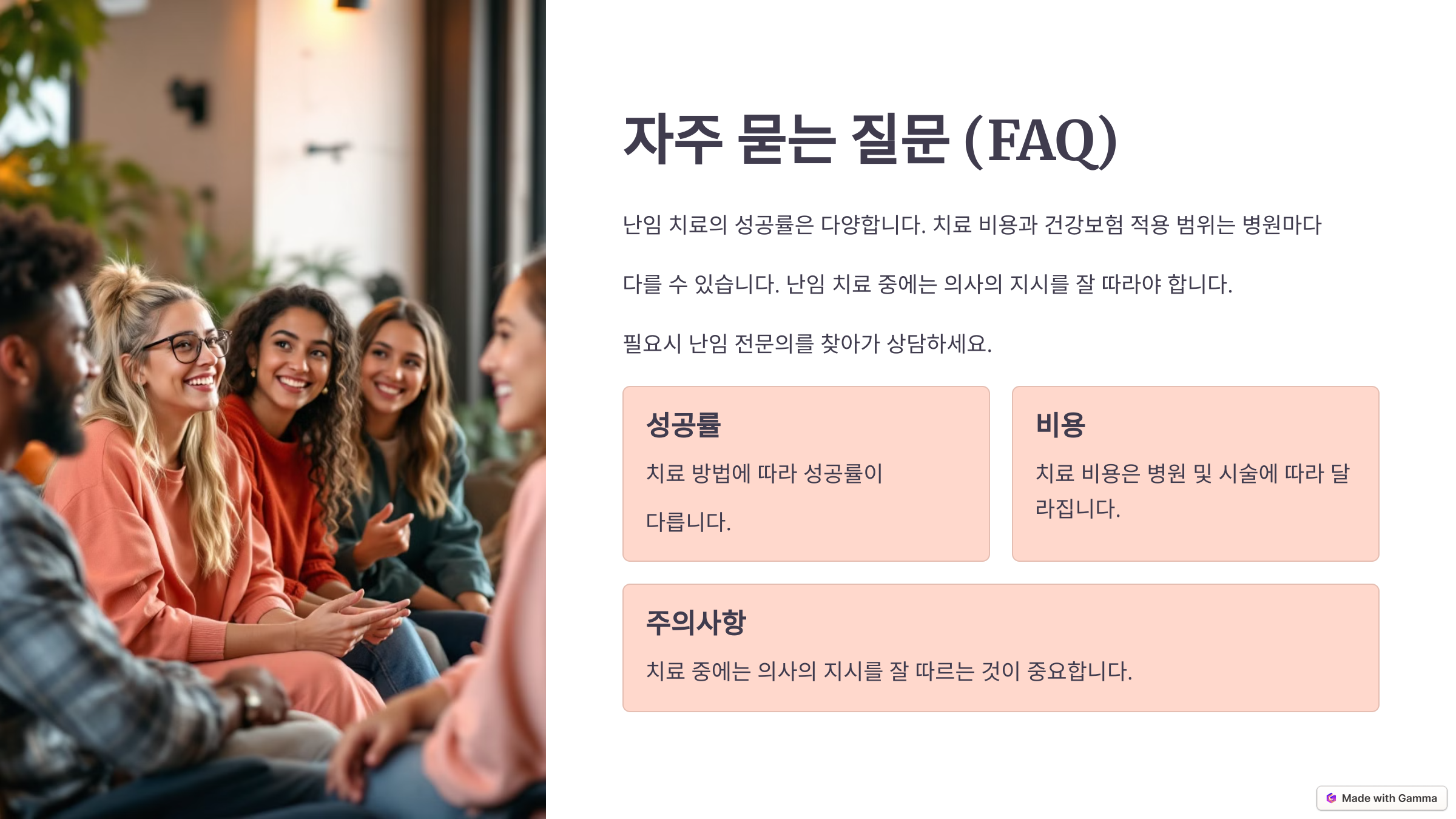 난임 치료는 한 가지 방법만 적용되는 것이 아니라, **개인의 상태에 따라 맞춤형 치료가 이루어져야 해요.** 또한, 자연 임신을 돕기 위해 생활습관을 개선하는 것도 매우 중요해요.